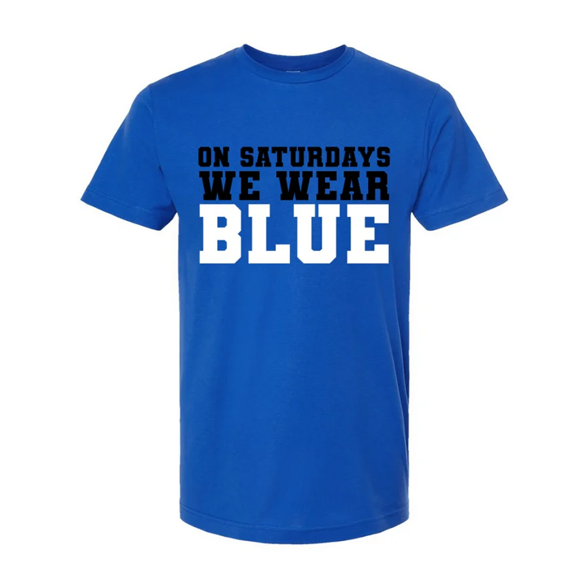 Make sure that everyone in town knows your favorite team colors when you wear this new t-shirt this football season. As a fan, your favorite colors all year long are Blue and White, so make sure that people know when wearing this "On Saturdays We Wear Blue" T-Shirt. The minimalist design features a bold graphic that proudly proclaims your weekend mantra, making it a perfect choice for laid-back Saturdays watching the games at home, or out in your seat, cheering for each play, this T-shirt effortlessly combines relaxed vibes with effortless style. Embrace the weekend spirit and make blue your new go-to with this essential addition to your game day wardrobe.